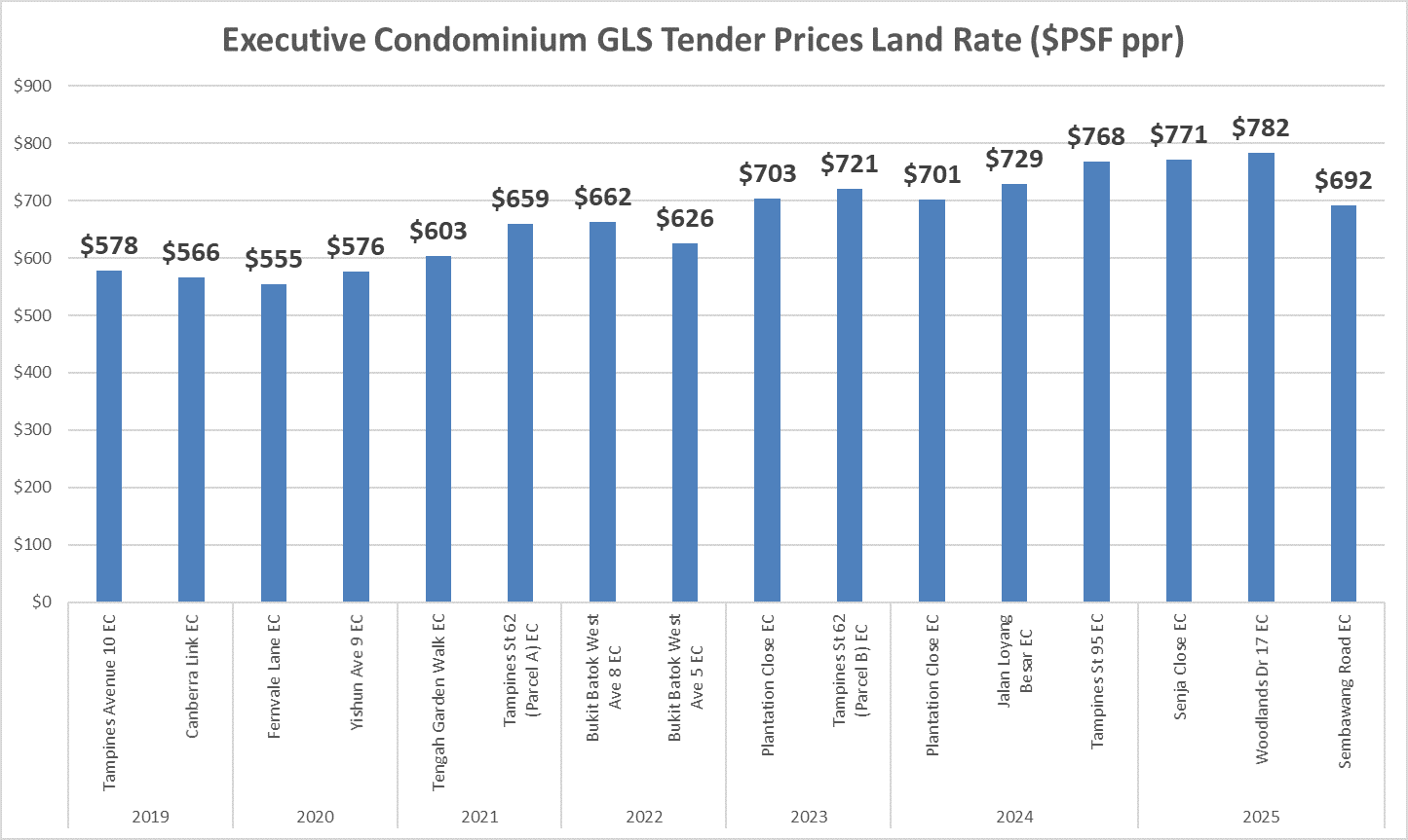 The biggest grouse perhaps has been the limited supply of ECs - up until now that is. In 2025, the HDB has through the twice-yearly government land sales (GLS) programmes set aside five new EC sites to be launched for tender in the year, more than twice the usual Confirmed List EC plots (specifically, two sites) launched each year in recent times. Meanwhile, the land rate for GLS EC sites also hit a record high in 2025.